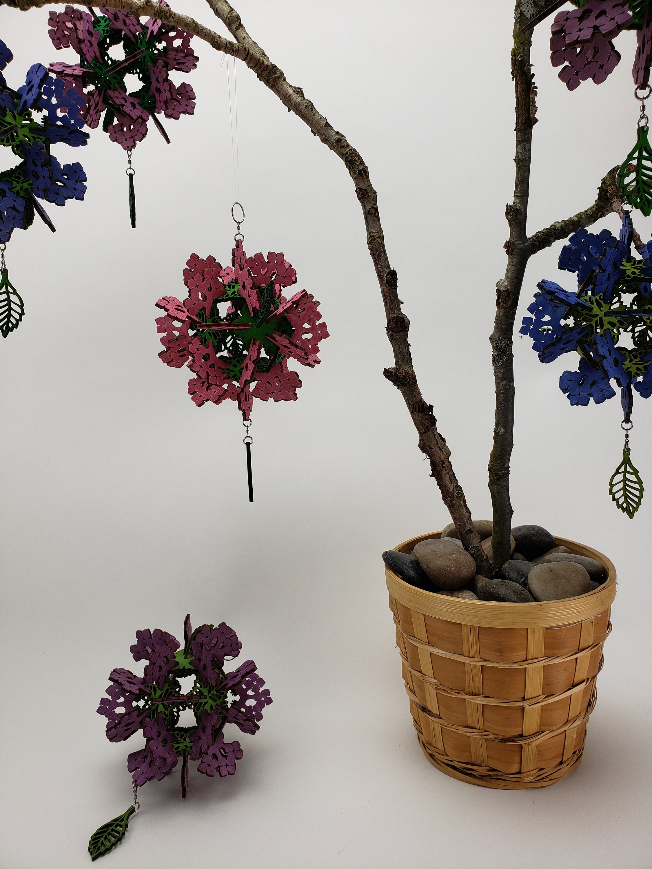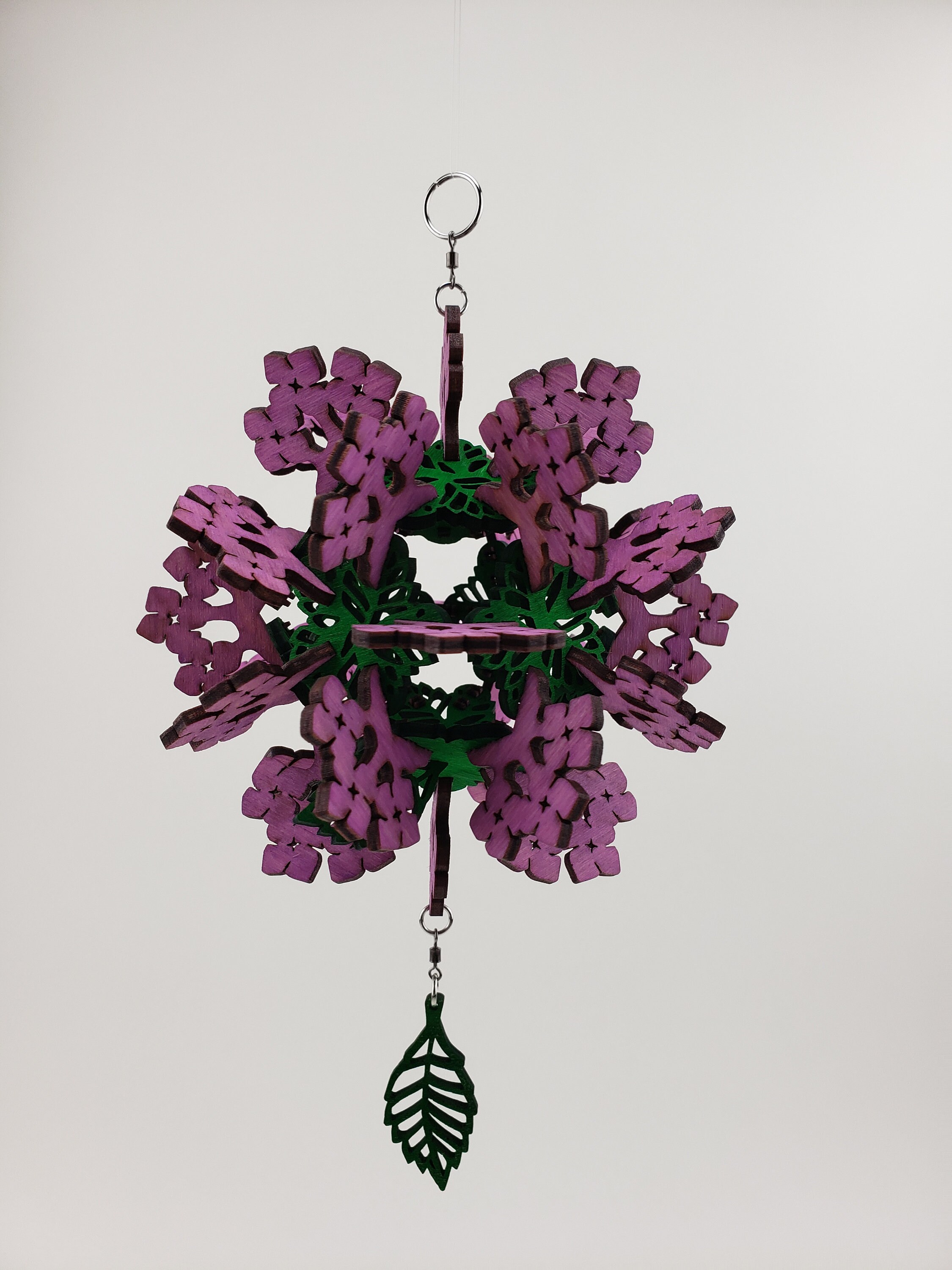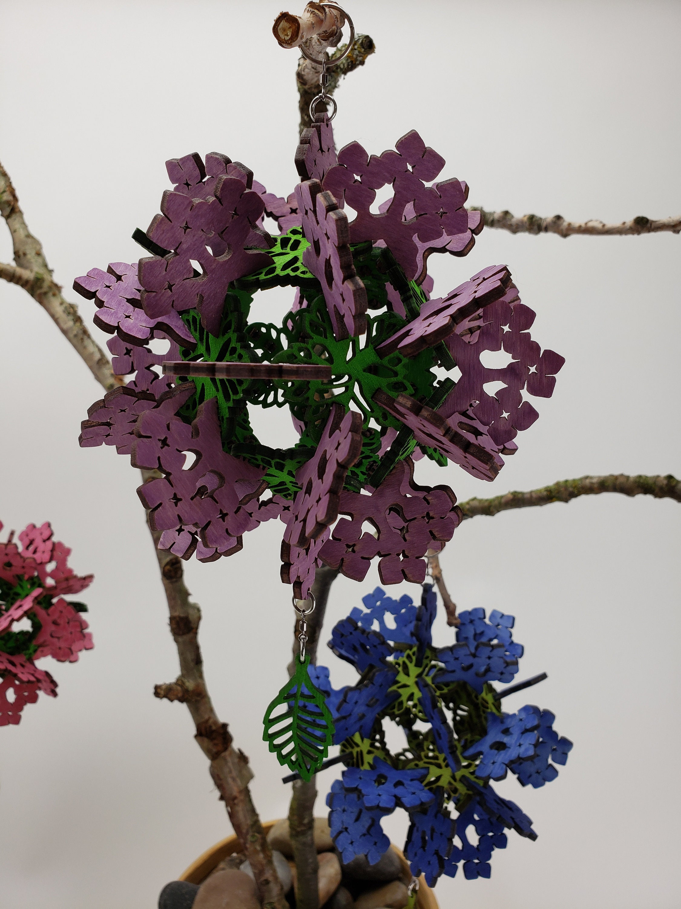 This hydrangea ornament is made of dyed birch plywood. The center of the ornament features leafy green panels with flower petals dyed in shades of blue, purple or pink.
