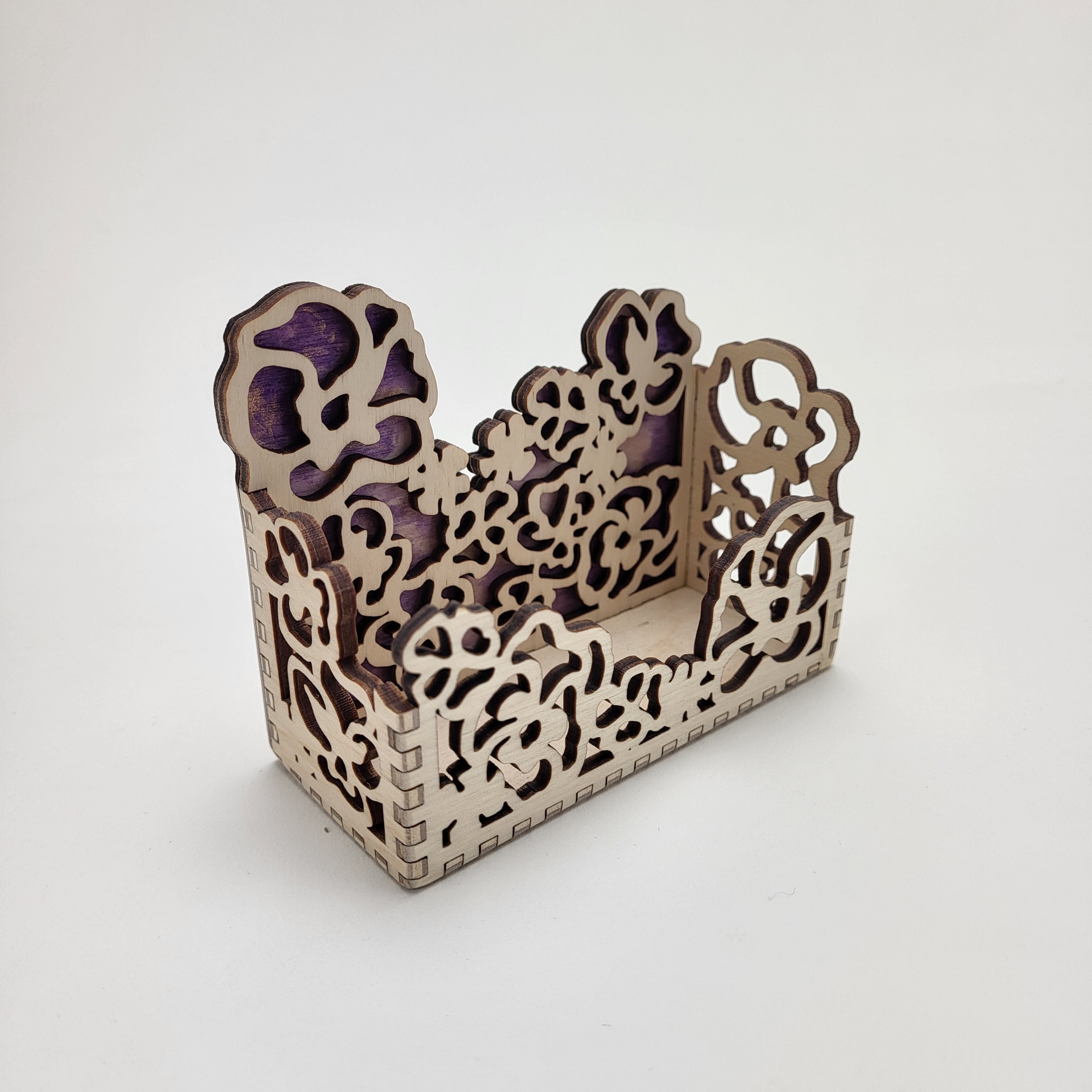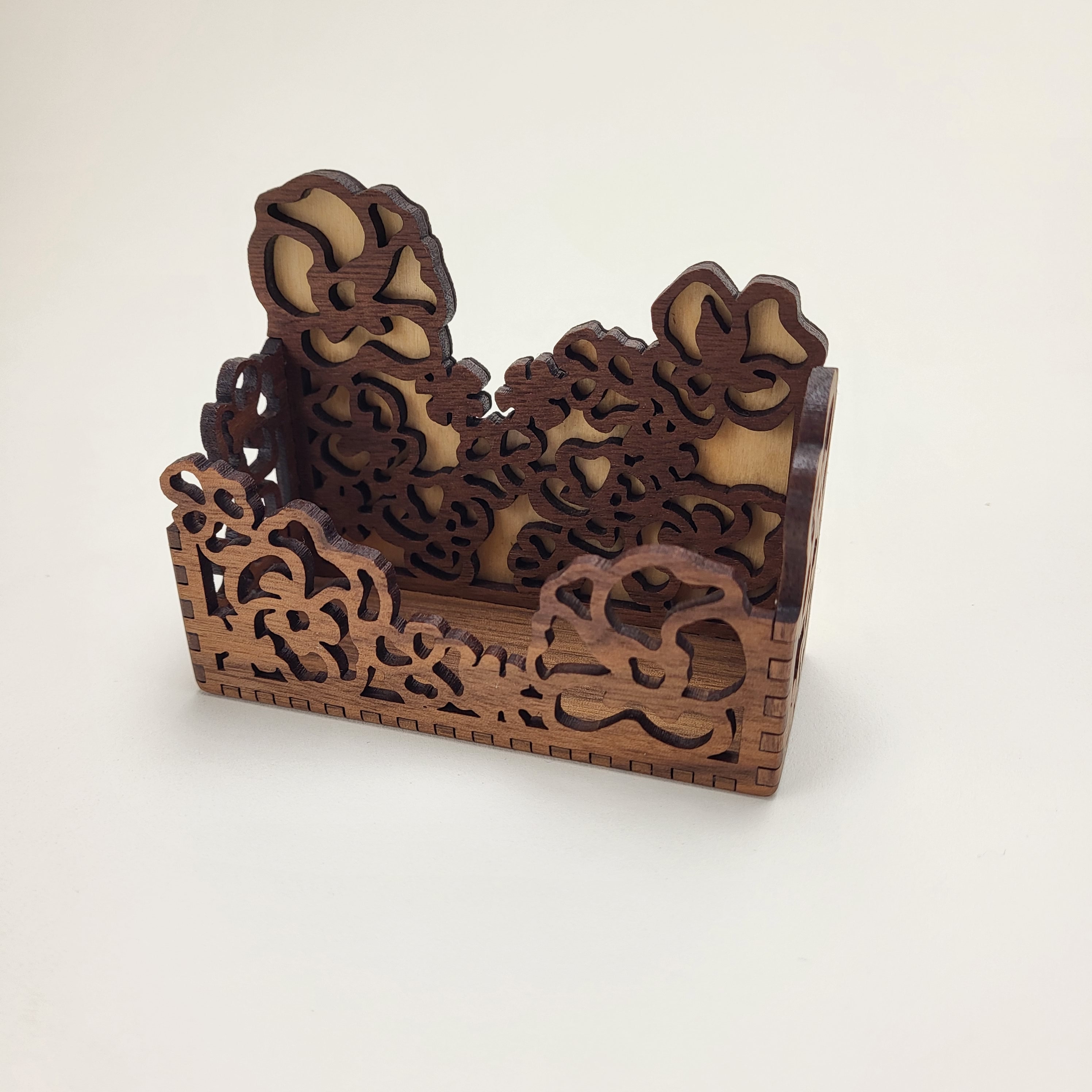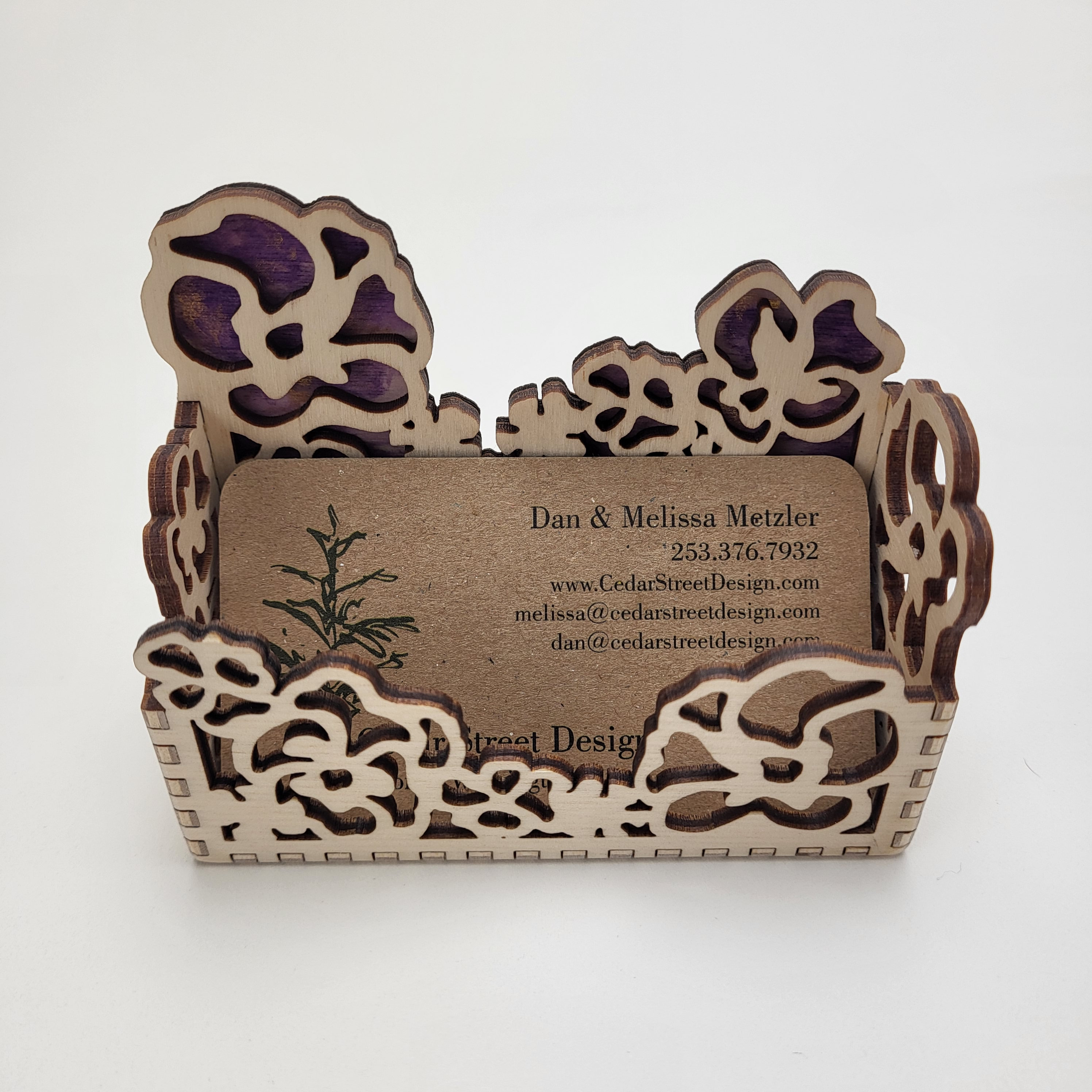 Celebrate Spring all year round with this delightful floral business card holder. It's available two ways -- birch with a hand painted background or a rich natural walnut with a birch background. It's a great way to decorate your desk and keep your cards handy.