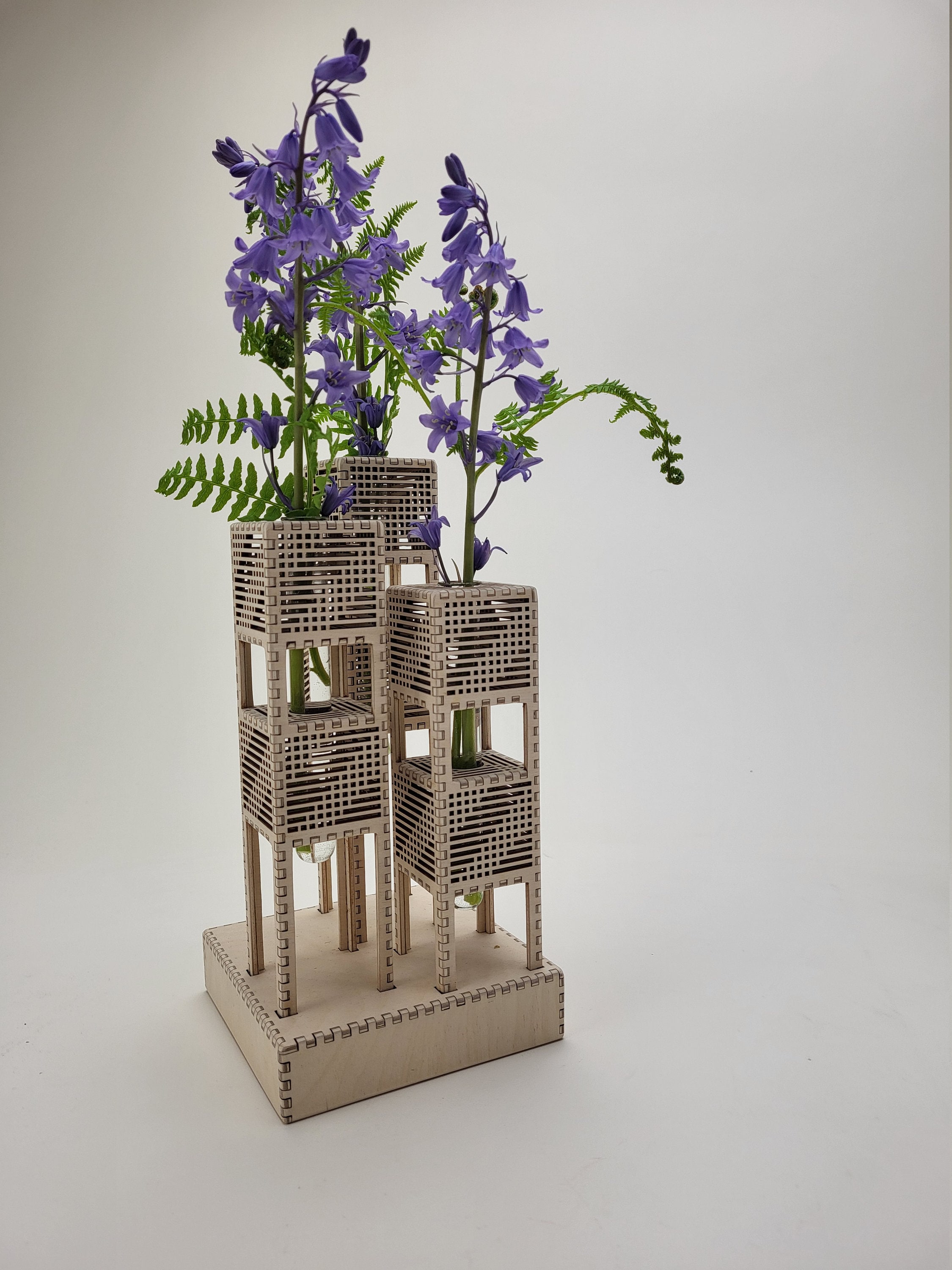 Three small towers hold test tubes perfect for displaying your favorite flowers or herbs. We include three 'perma flowers' you can use as decorative place holders when you don't have any actual flowers! The vase towers sit on top of a sturdy base for stability. And of course, you can remove the test tubes to wash them if they get grubby. This vase comes in two patterns you can choose from - a lacy heart pattern or a stylish geometric.