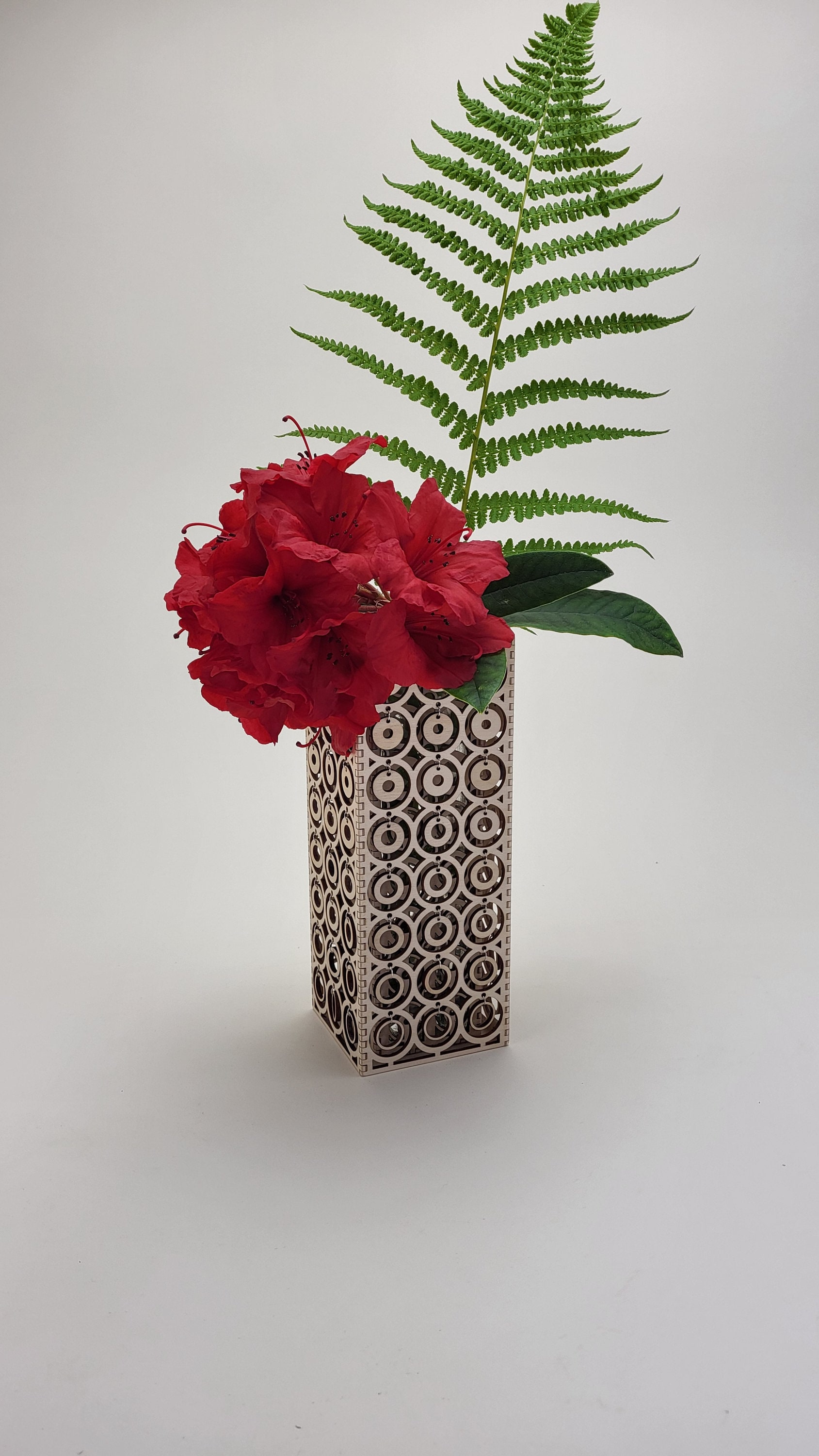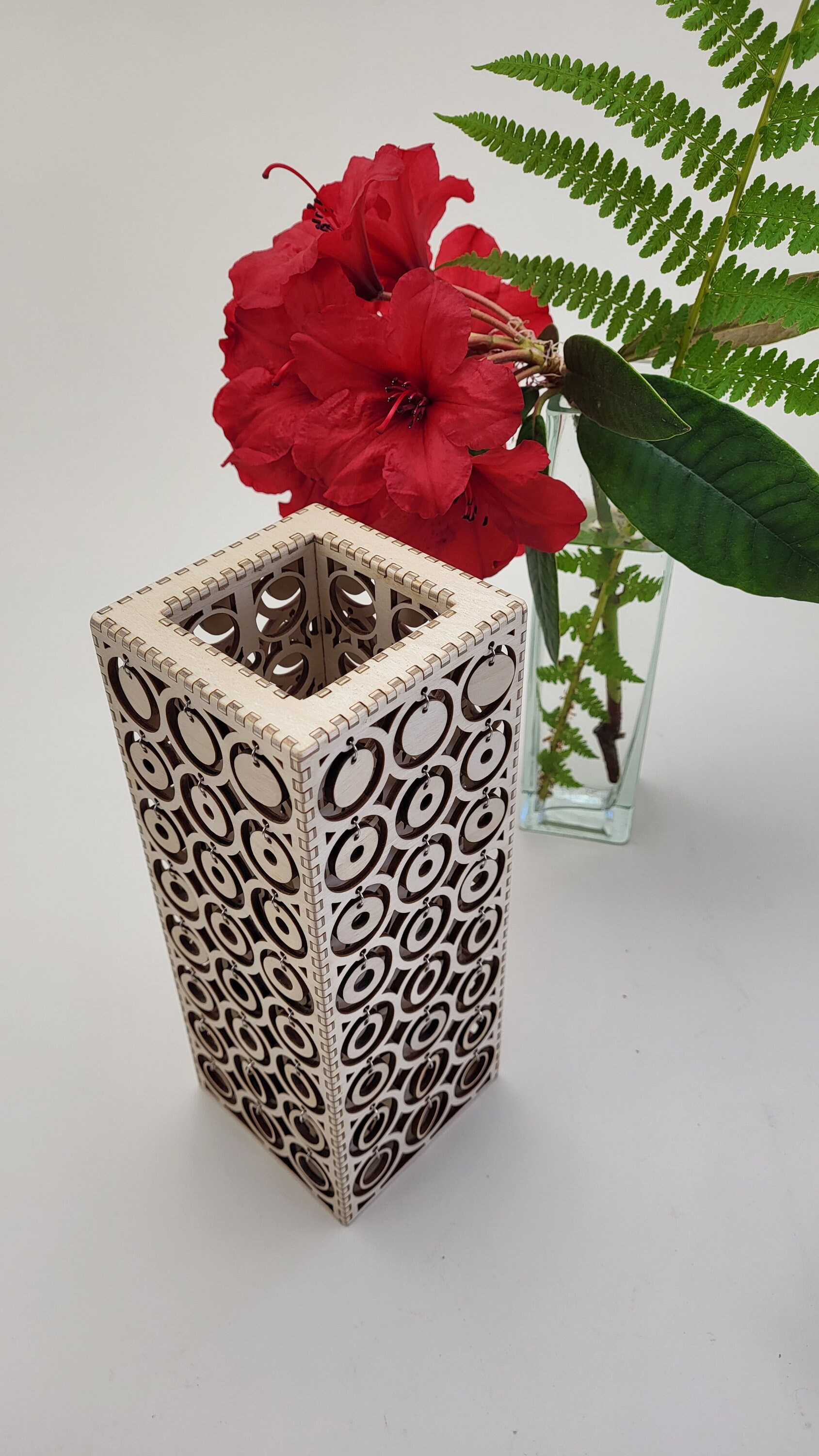 This entertaining and attractive vase mirrors the design of our Circles and Dots Lamp. It features a layered birch plywood sleeve with moving charms covering the outside. The glass vase inside slips out for easy washing. Designed and hand made in our shop. Each of the 96 charms are hand sanded and hung by tiny steel jump rings. The swaying charms add motion to your floral display.