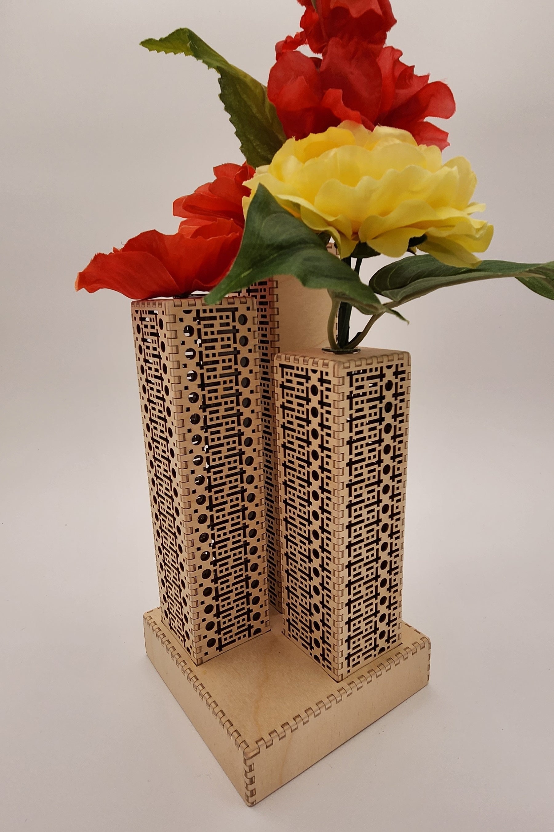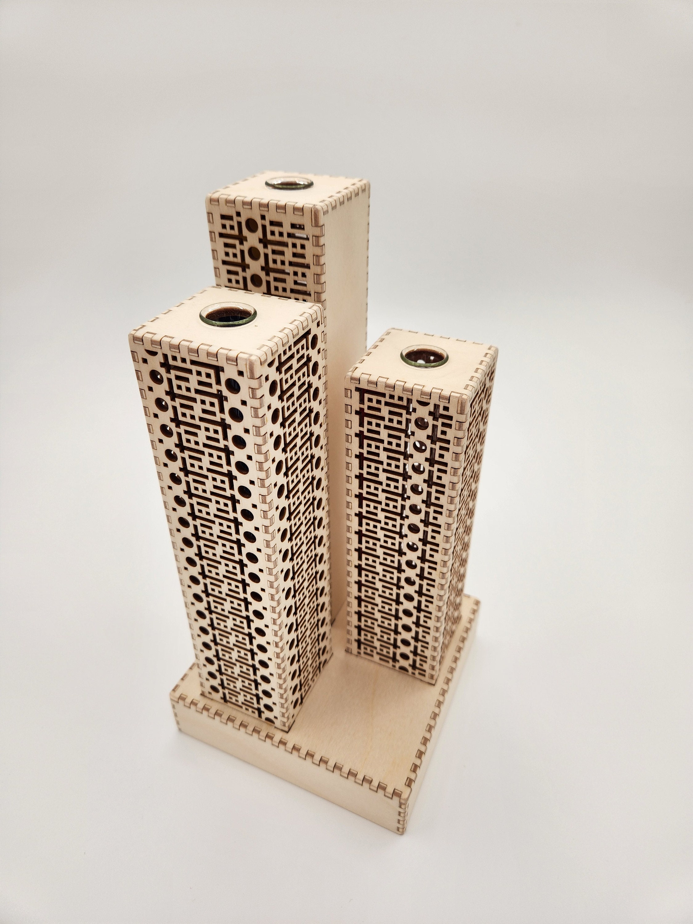 Three small towers hold test tubes perfect for displaying your favorite flowers or herbs. The vase towers sit on top of a sturdy base for stability. And of course, you can remove the test tubes to wash them if they get grubby. The inside of each tower has extremely subtle accent color that you only see when the light is at just the right angle. Color choices are primary colors or silver.