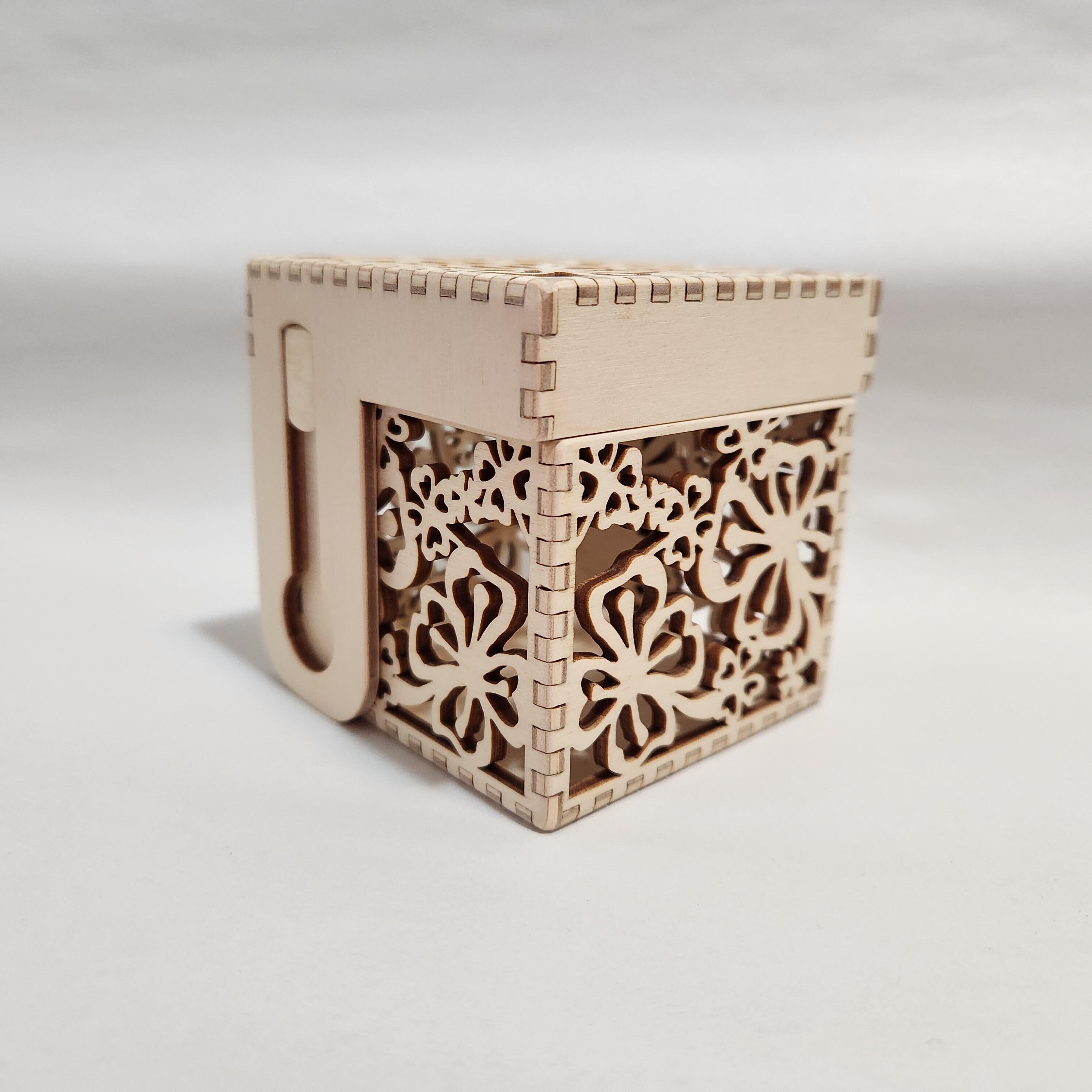 This little box has a pivot hinged lid that flips up and back. The top features a detailed cut out pattern. Carefully designed and hand made in our shop; all edges sanded smooth. This box is perfect for something precious or practical. Approximately 2 7/8 inches on all sides.