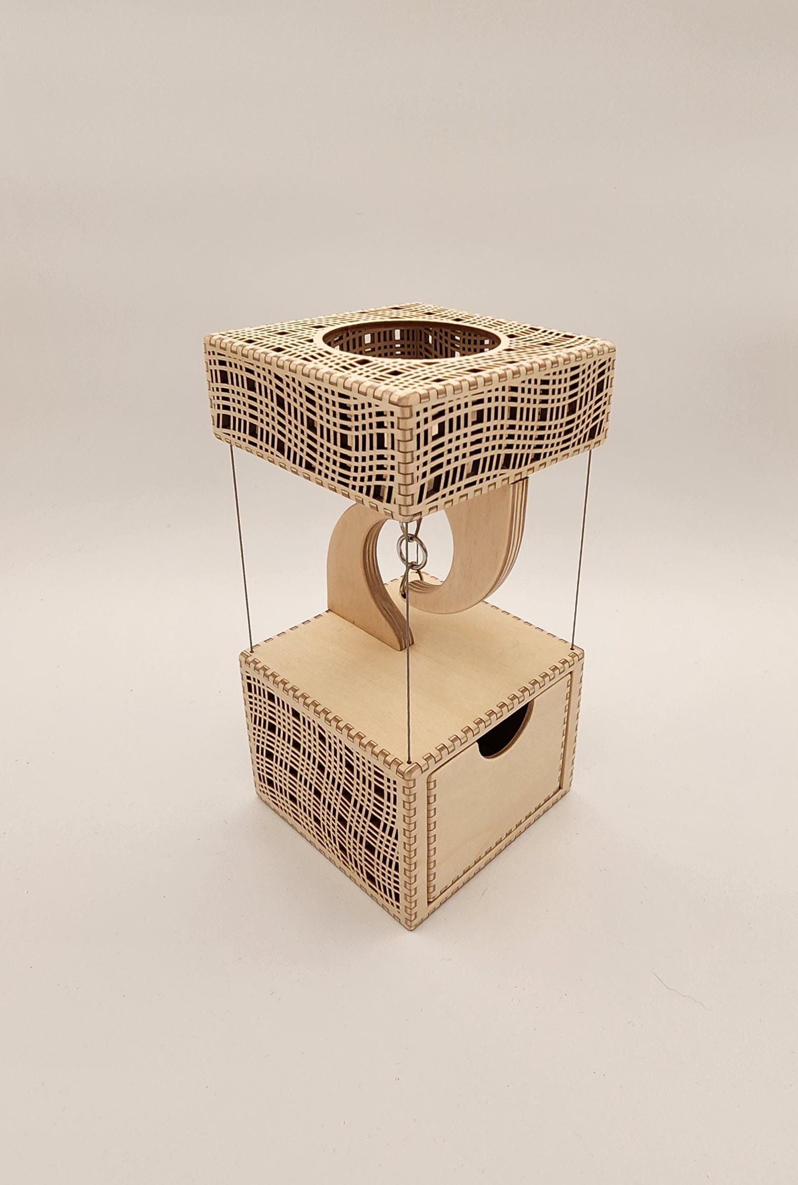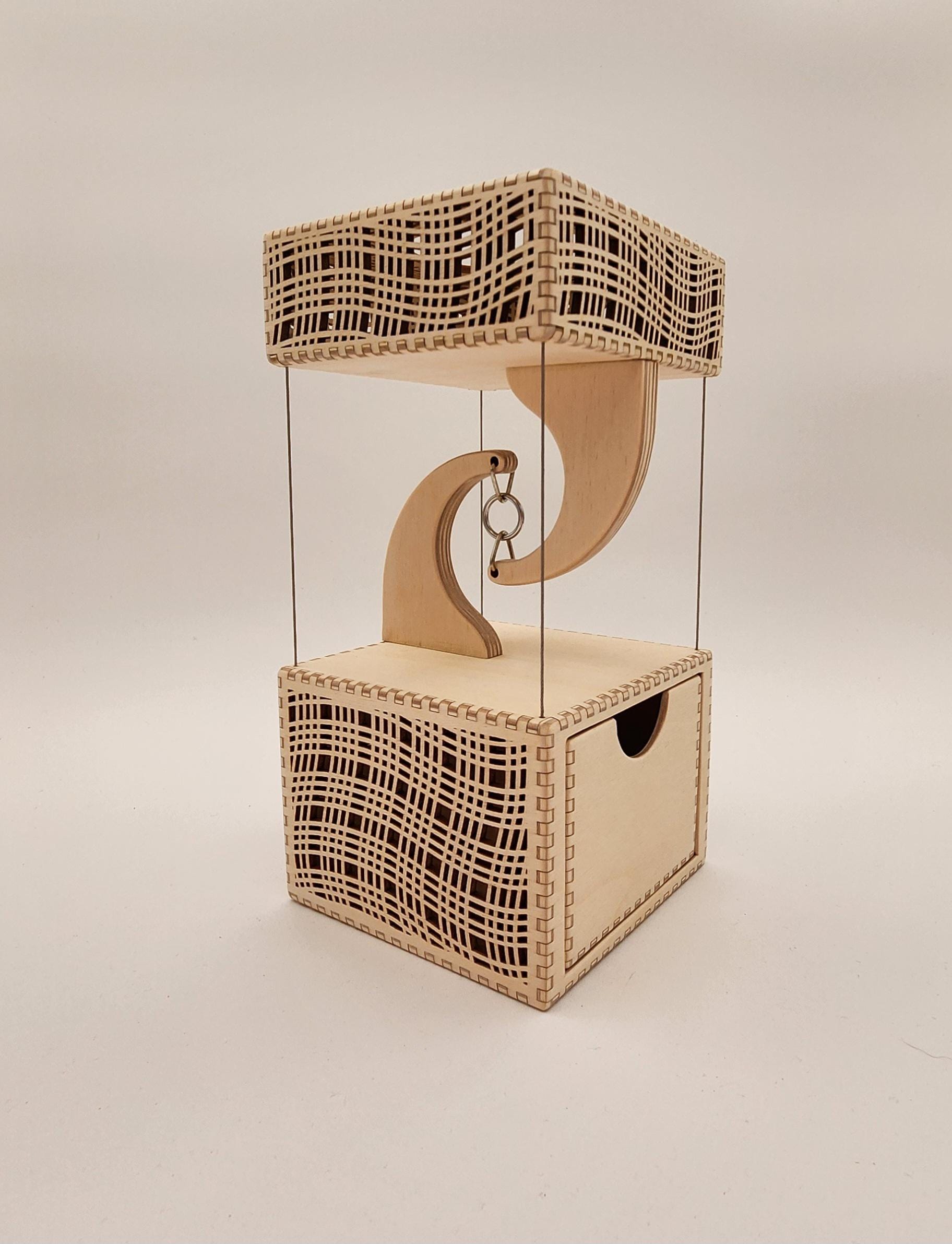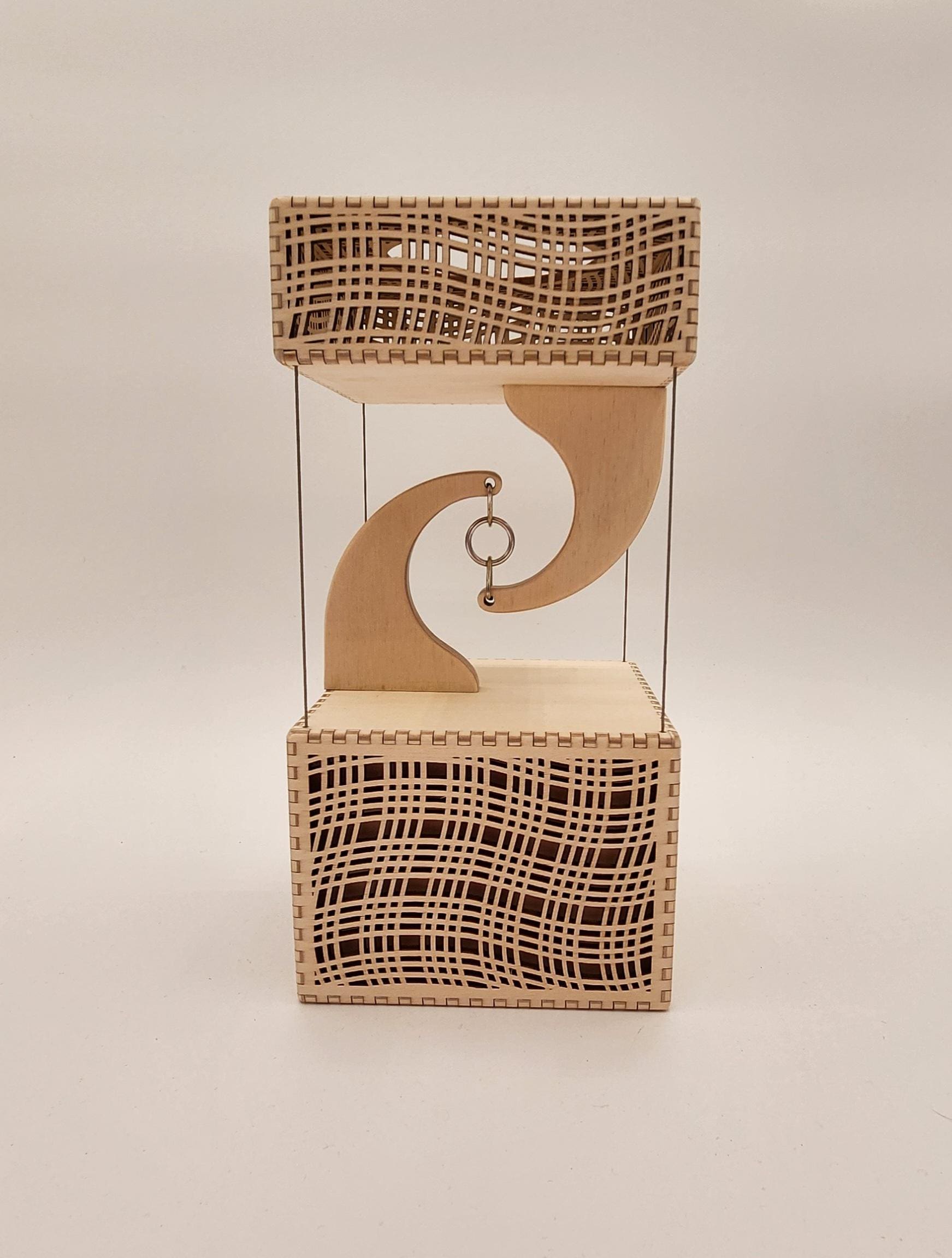This box uses tensegrity and appears to float on thin steel cables. It's made of birch plywood. Designed and constructed by Melissa Metzler. It can have an inscription added if desired.
