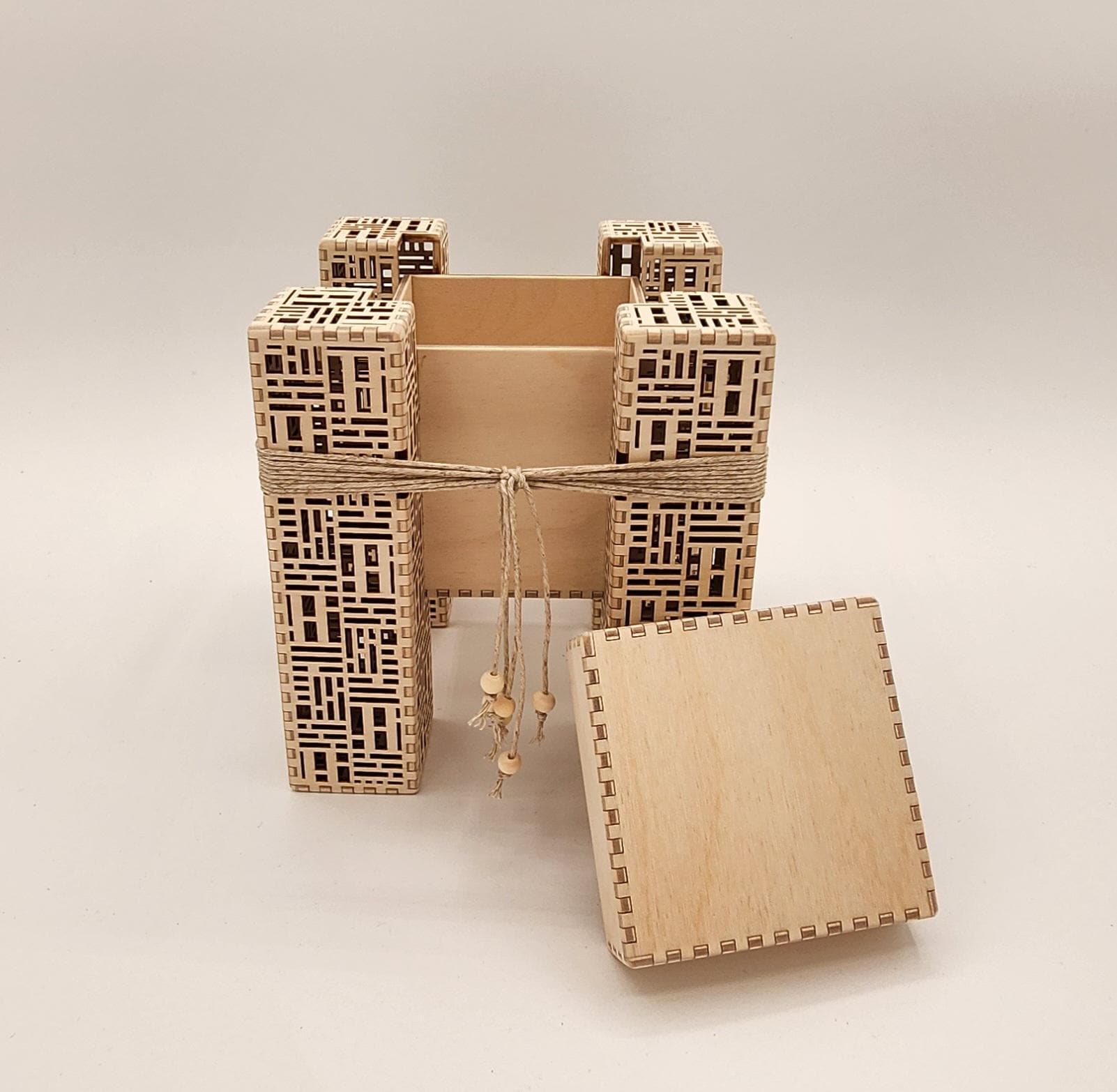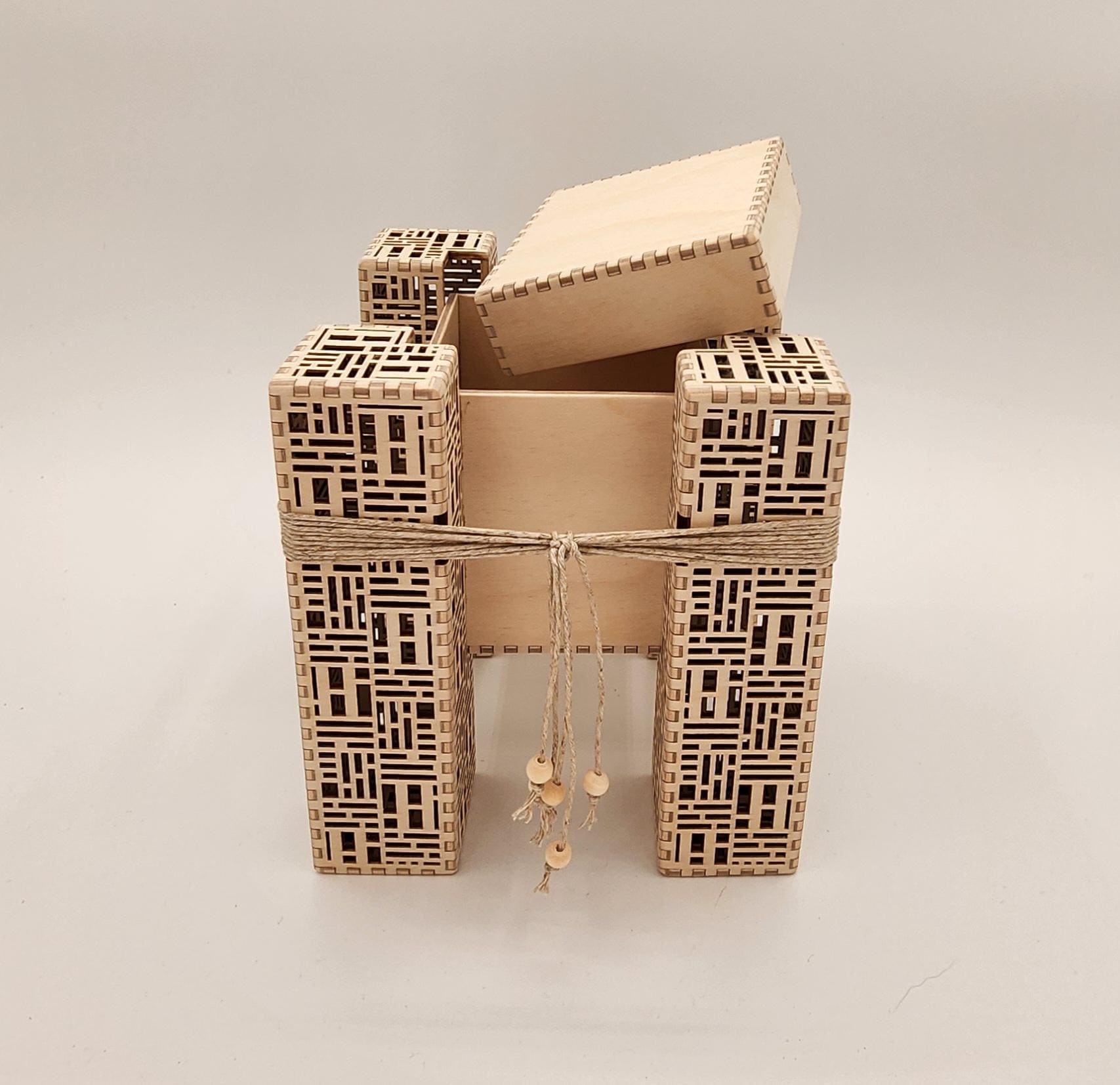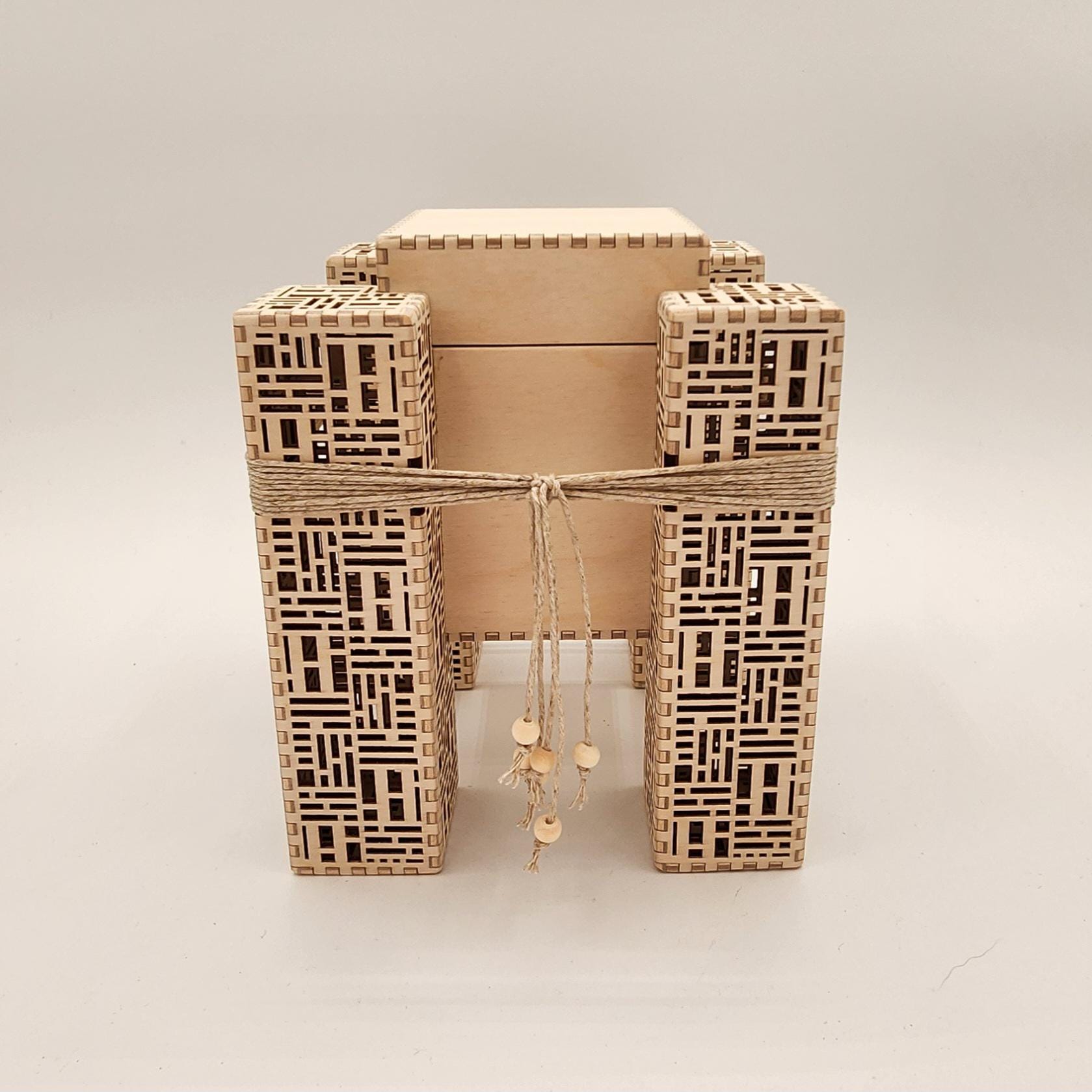 This small box would make a lovely and unusual gift. It's made of laser cut birch plywood with a hemp cord accent. Designed and carefully handmade by Melissa Metzler in our Mason County, WA studio.